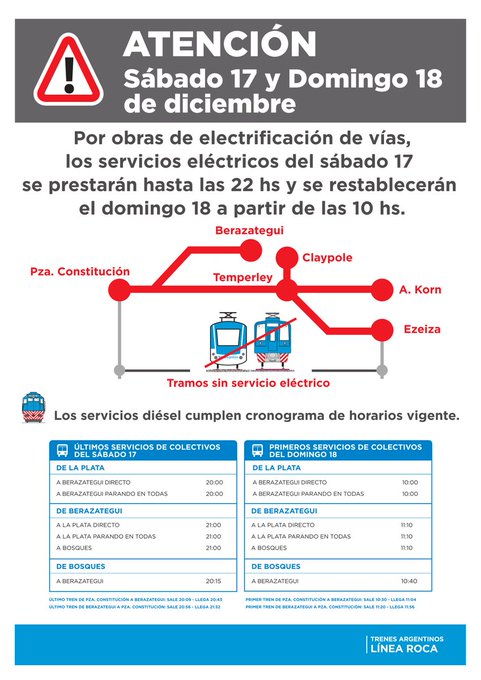BUENOS AIRES 17 Dic(LGR prensa). Por medio del siguiente comunicado la Linea Roca informa a sus pasajeros que los siguientes ramales no estaran operativos por tareas de electrificacion de vias.