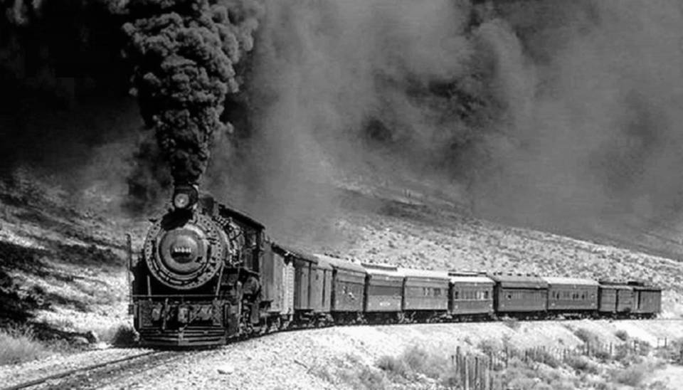 La locomotora a vapor, venciendo con gran esfuerzo la cordillera de los Andes.