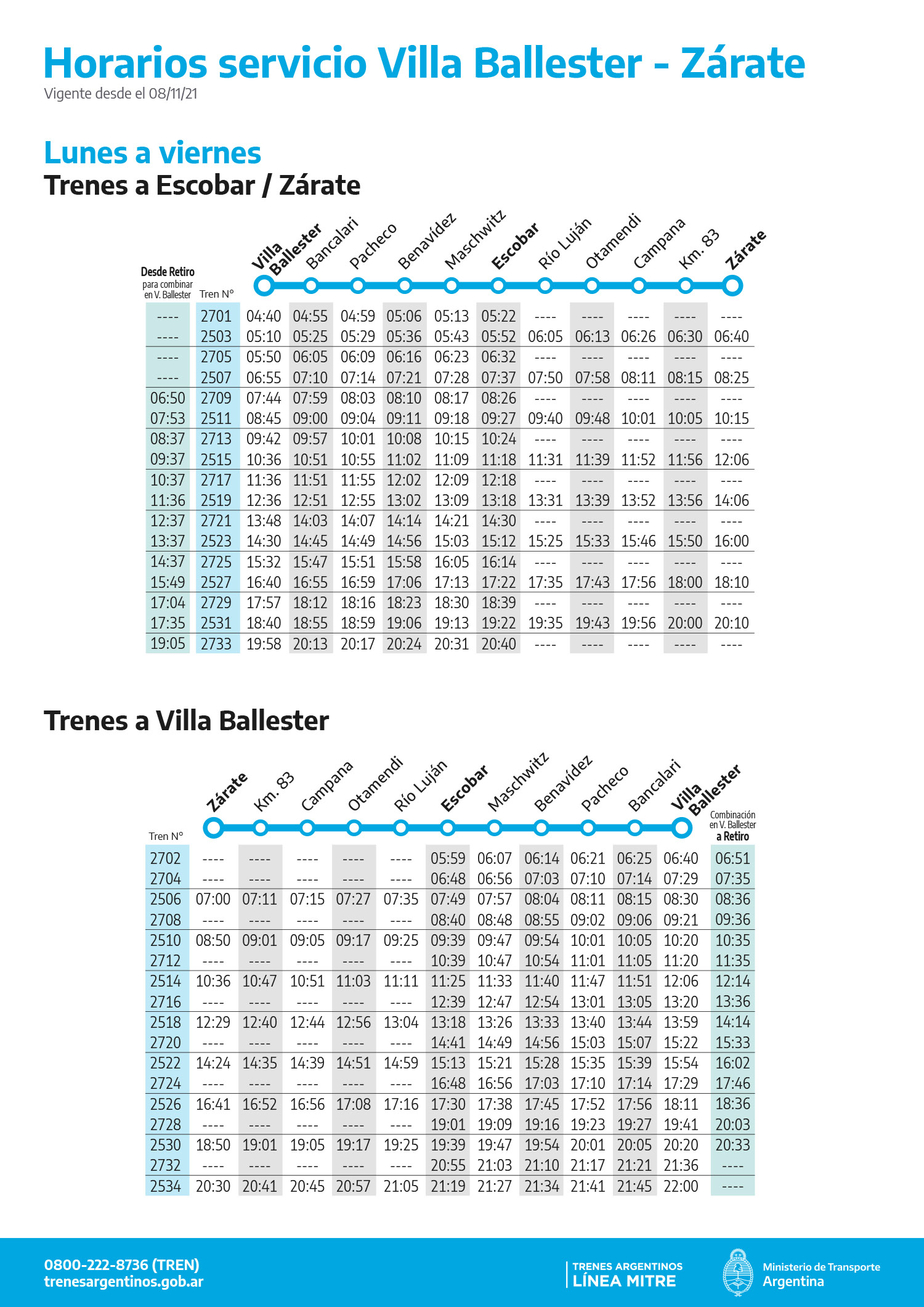 Desde el lunes 8/11 mejoraremos la frecuencia del ramal Villa Ballester - Zárate y sumaremos más servicios cortos entre Villa Ballester y Escobar. De esta manera, brindaremos más opciones de viaje, con menor tiempo de espera para los pasajeros y las pasajeras. Consultá el cronograma completo de horarios.