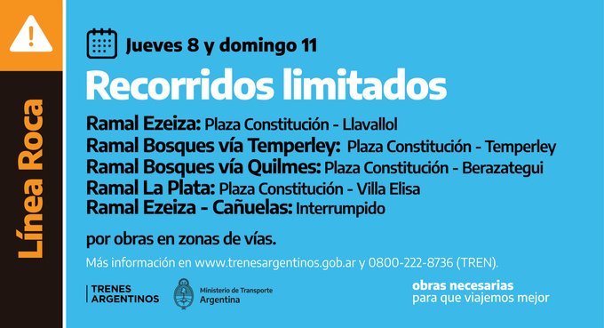Además, los trenes del ramal Bosques vía Temperley circularán con recorrido limitado entre Plaza Constitución y Temperley, por obras en zona de vías en Florencio Varela, en tanto el servicio entre Bosques y Gutiérrez no circulará.De igual modo, hasta este domingo los trenes del ramal Ezeiza circulan con recorrido limitado entre Plaza Constitución y Llavallol, por renovación de vías entre Luis Guillón y Ezeiza, no circulará el servicio entre Ezeiza y Cañuelas.