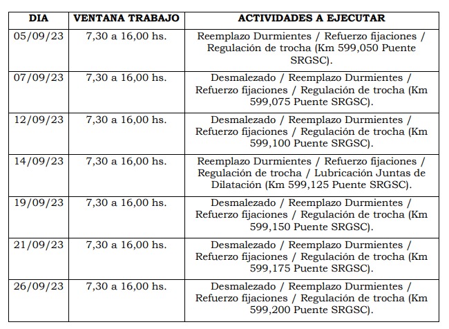 POSADAS Misiones 4 Sept (LA Voz de Misiones).-Al igual que en los meses de julio y agosto, el servicio de tren internacional no funcionará algunos días de septiembre, debido a tareas de mantenimiento.