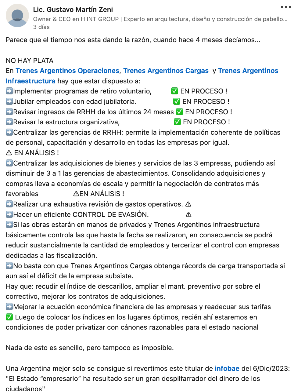 Gustavo Martín Zeni es el titular de la consultora Ferroconsud, una de las que asesora al Gobierno en el proyecto de reforma y reprivatización del sistema ferroviario. En su cuenta en LinkedIn, es el propio Zeni el que celebra las medidas del gobierno de Milei y anticipa las próximas, incluyendo la reducción de personal y la “revisión de gastos operativos”. Según argumenta Zeni, una vez mejorada la ecuación financiera de las empresas y readecuadas las tarifas, “recién ahí estaremos en condiciones de poder privatizar con cánones razonables para el Estado nacional”.