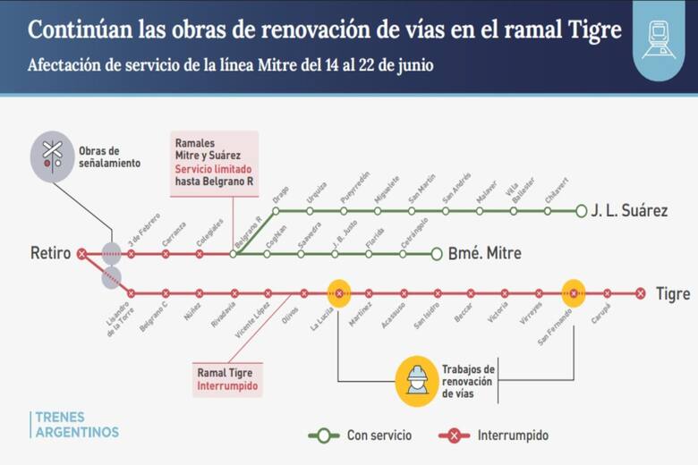 Se trata del ramal Tigre de la línea Mitre, que no funciona desde el sábado 14 de junio hasta el domingo 22 de junio. Esto afecta el servicio Retiro - Tigre y se debe a las obras de renovación de vías que se llevan a cabo entre Maldonado y Tigre.