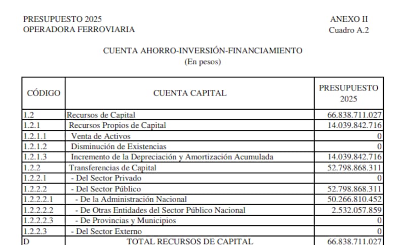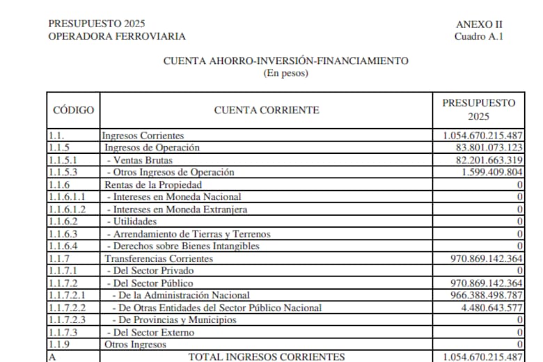 La cifra exacta de la suma de las transferencias corrientes y de capital que la empresa ferroviaria estipula recibir se escribe $1.023.668.010.675, que equivale a $2804 millones por día a lo largo de todo 2025.