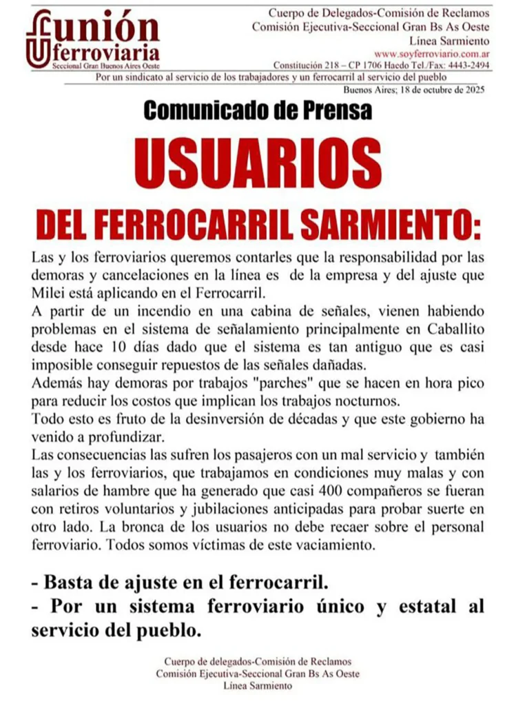 “Queremos contarles que la responsabilidad por las demoras y cancelaciones en la línea es de la empresa y del ajuste que Milei está aplicando en el tren Sarmiento”.