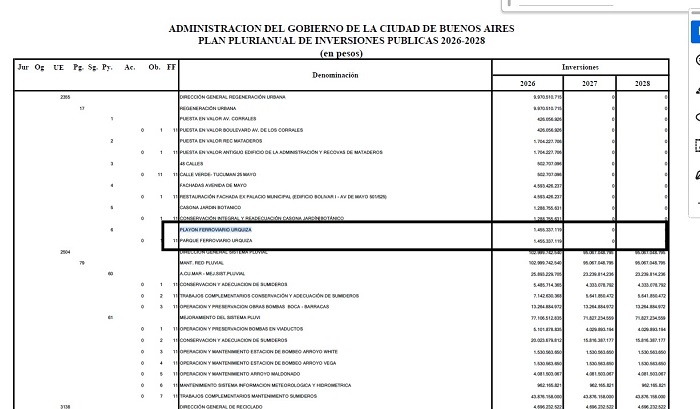 Uno de los temas de mayor debate y movilización vecinal en los últimos años tuvo que ver con lotes de la manzana donde se sitúa la Estación Urquiza, en el epicentro del barrio. Con idas y vueltas, el Gobierno de la Ciudad buscó, tras hacer un acuerdo con la Nación, rematarlos para construir torres y dejar una parte que quedaría como espacio público. Después de un largo tiempo sin novedades, cambio de administración de por medio, el Presupuesto 2026 presentado la última semana retoma con fuerza la iniciativa.Es que en la "Ley de Leyes" oficializada por la gestión de Jorge Macri, dentro del apartado del "Plan Plurianual de Inversiones Públicas para el período 2026-2028", se asigna una partida para la creación del "Playón Ferroviario Urquiza". Para eso, se fija un presupuesto de $1.455.337.119 a ejecutarse durante el año que viene.