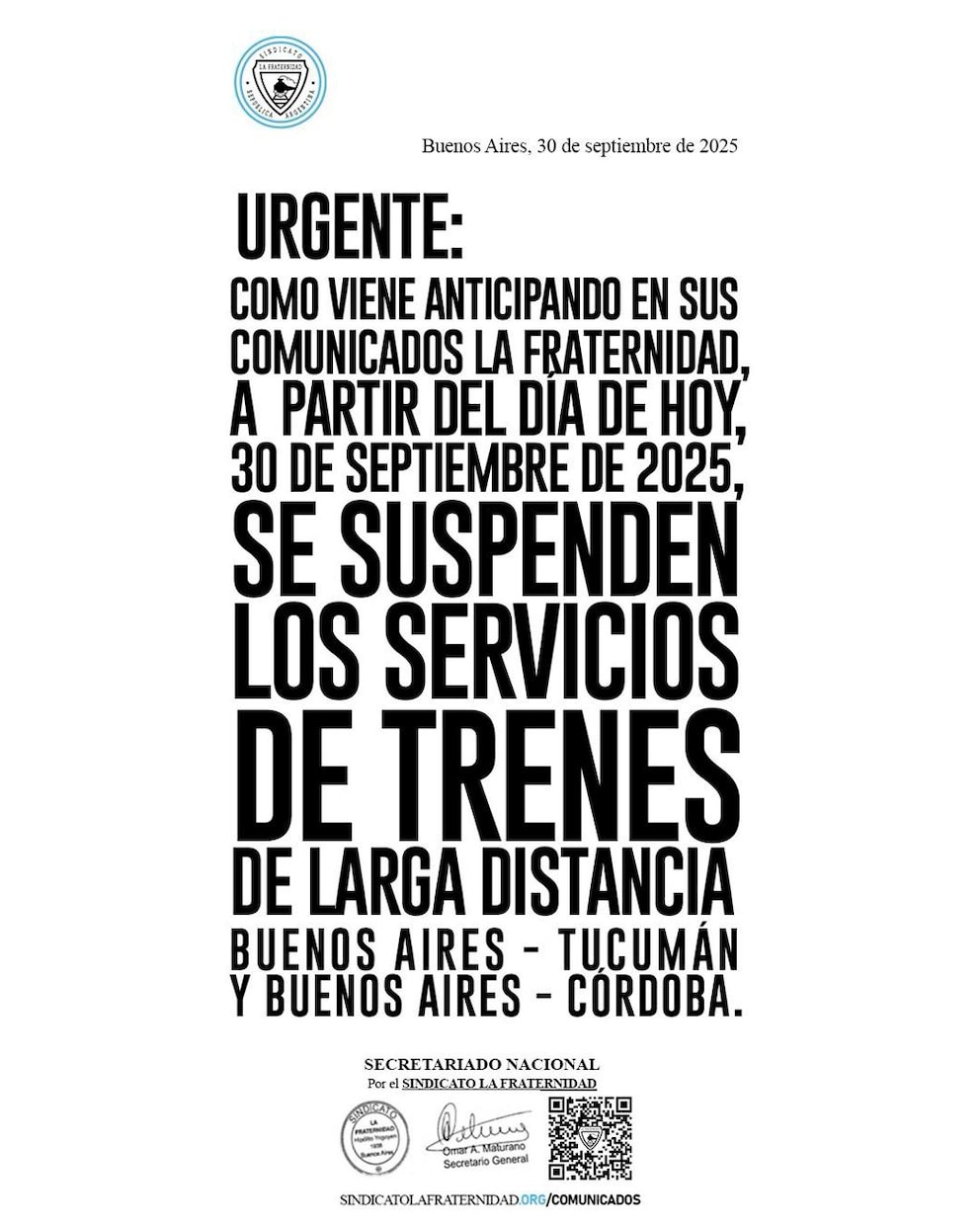 CORDOBA 30 Sept (El Doce TV).-También quedaron interrumpidos los servicios de larga distancia a Tucumán. La concesionaria NCA detectó fallas en las vías y ordenó un relevamiento.