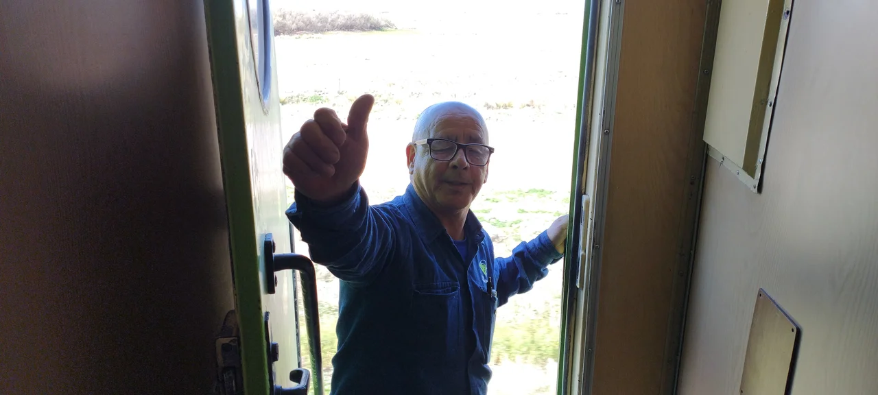 Para mover la formación son necesarias varias personas: el maquinista, los guardias y los camaristas. Cristian Guerra tiene 58 años y hace más de 24 que le dedica su vida al tren. A pesar de todo lo que vio no deja de sorprenderse: “Me encanta el tren, me encanta viajar”, dice mientras toma fotos con su celular y mira cómo se va desmenuzando el paisaje.