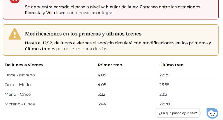 Hasta el 12/12, de lunes a viernes el servicio circulará con modificaciones en los primeros y últimos trenes por obras en zona de víasEn cuanto al ramal Once-Merlo, el funcionamiento también se ajustó: las formaciones inician a las 4.05 y concluyen a las 23.55. En dirección opuesta, el primer tren sale a las 3.32 y el último arriba a las 22.31.