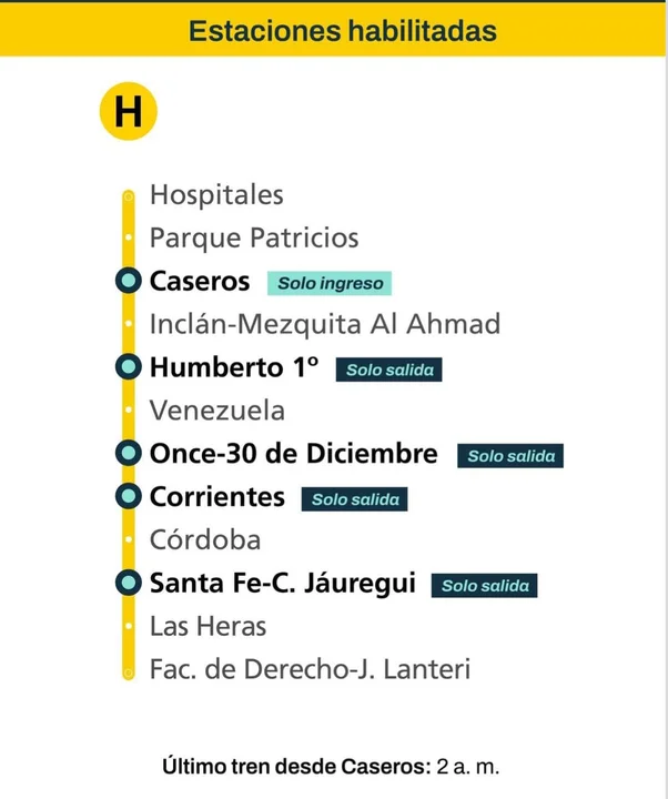 Desde la cuenta oficial del subterráneo de Buenos Aires se informó que el ingreso estará habilitado únicamente en la estación Caseros, mientras que habrá cuatro estaciones habilitadas solo para descenso de pasajeros: Humberto 1°, Once–30 de Diciembre, Corrientes y Santa Fe–C. Jáuregui. Cabe destacar que la línea no funcionará de manera completa, sino con paradas limitadas y sin posibilidad de ascenso fuera de Caseros.