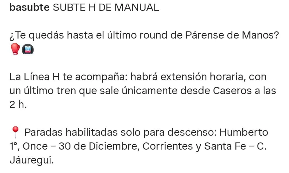 “¿Te quedás hasta el último round de Párense de Manos? La Línea H te acompaña: habrá extensión horaria, con un último tren que sale únicamente desde Caseros a las 2 h”, expresó la cuenta verificada del metro de Buenos Aires.