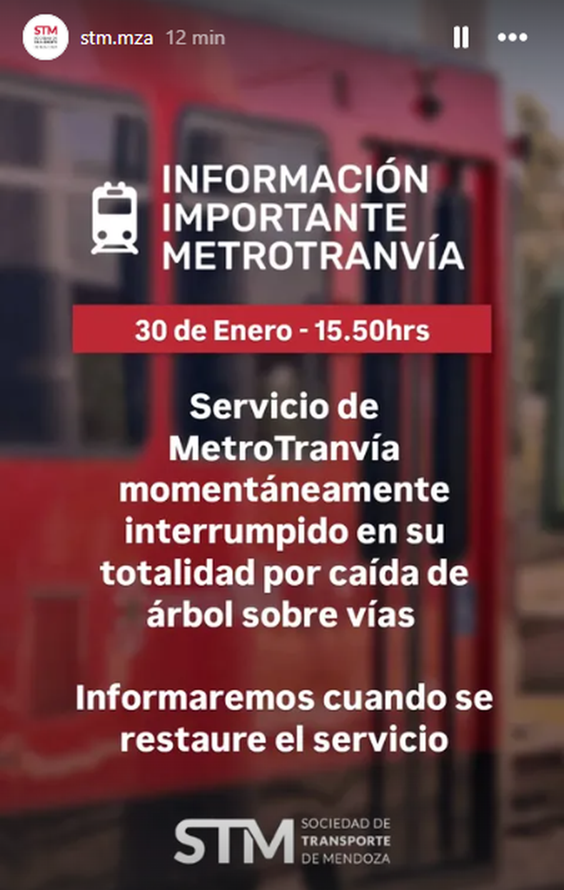 Pasado el mediodía, el diluvio se hizo presente en el centro mendocino. Gran caudal de agua y un poco de granizo captó la atención de mendocinos y mendocinas que miraron por la ventana lo que ocurría en la calle. No obstante, hubo una consecuencia directa de estas contingencias y es la suspensión momentánea del servicio de Metrotranvía.