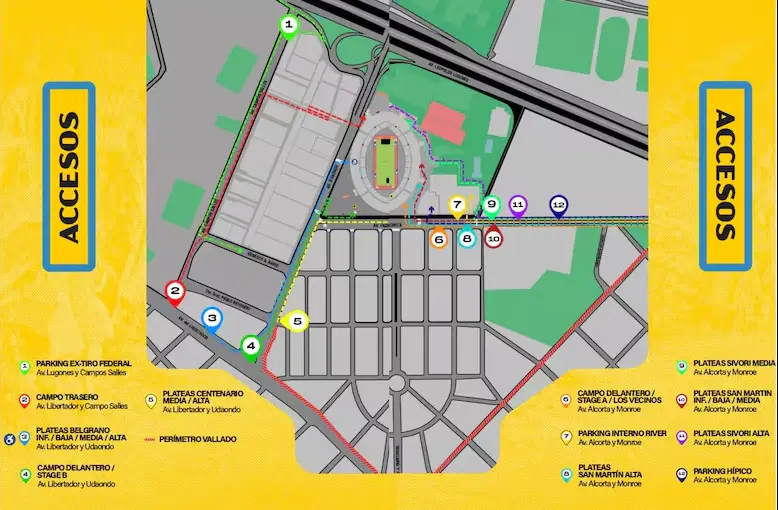 Los accesos fueron organizados según el tipo de entrada: quienes tengan campo trasero deberán ingresar por avenida Libertador y Campos Salles; los sectores plateas Belgrano (inferior, baja, media y alta), campo delantero / stage B y plateas centenario (media y alta) accederán por avenida Libertador y Udaondo; mientras que las entradas para campo delantero / stage A / Los Vecinos, plateas San Martín (inferior, baja, media y alta) y plateas Sívori (media y alta) tendrán su ingreso por avenida Alcorta y Monroe.