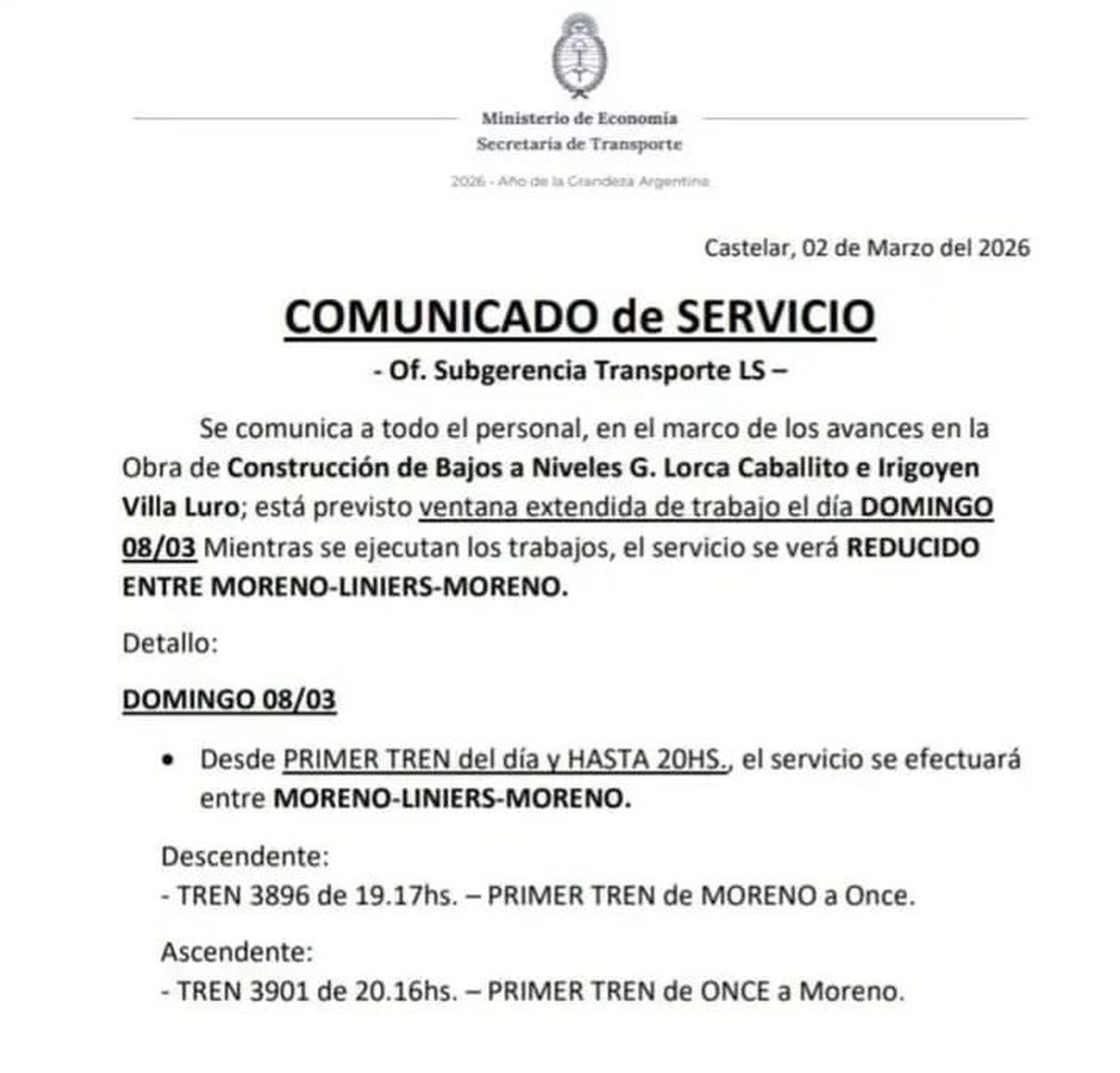 Los usuarios del ramal Once-Moreno de la Línea Sarmiento -operada por la estatal Trenes Argentinos- enfrentarán este domingo 8 la tercera alteración del servicio en un mes, pero será la más acotada: solamente el tramo Once-Liniers será el que no contará con la circulación de trenes, desde el inicio de la jornada, hasta alrededor de las 20: el primer tren de Moreno a Once saldrá a las 19.17, y el primero de Once a Moreno a las 20.16.Según un comunicado de servicio interno de la Línea Sarmiento fechado el lunes, y difundido en las redes sociales, la razón de la restricción es que en el marco de los avances de las obras de construcción de los cruces a bajo nivel situados a la altura de las calles Federico García Lorca (junto a la estación Caballito); e Irigoyen (a 200 metros de la estación Villa Luro) "está prevista una ventana extendida de trabajo el domingo 8 de marzo".