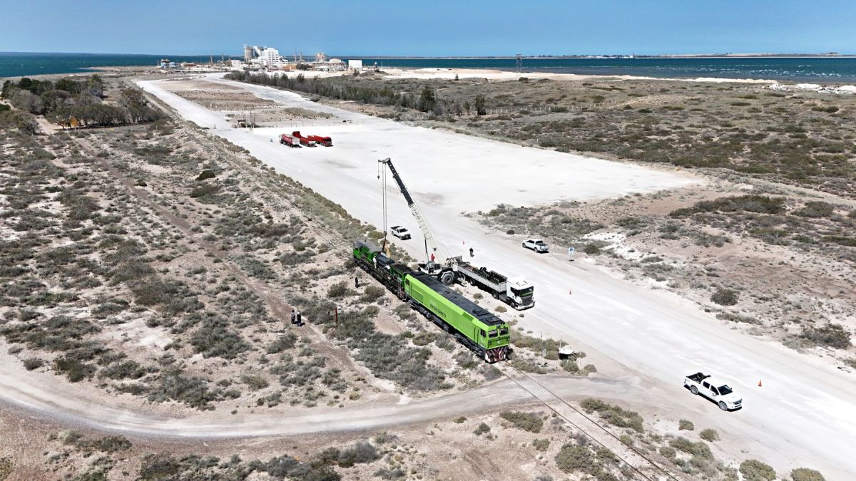 Después regresé al hotel para desayunar y esperar otro movimiento ferroviario previsto para el mediodía. A esa hora volví a la estación de San Antonio Oeste. Allí me encontré con Pedro, maquinista de Tren Patagónico, con quien había intercambiado mensajes durante meses. La locomotora 319-316 sería la encargada de trasladar a la GT22CW-2 9073 hacia la planta de Álcalis de la Patagonia (Alpat), donde se le instalaría su motor diésel recientemente reparado.