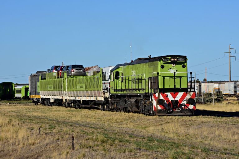La locomotora 319-316 sería la encargada de trasladar a la GT22CW-2 9073 hacia la planta de Álcalis de la Patagonia (Alpat).Cuando todo estuvo listo, el tren partió encabezado solo por la 9070. Yo lo esperé sobre el puente de la RP 2, donde la luz de la mañana lo iluminaba perfectamente con las mesetas patagónicas de fondo. Seguí registrando el convoy hasta el paso a nivel de la Ruta Nacional A025, en el ingreso a San Antonio Este.