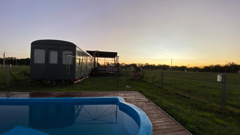 Por fuera, Juan construyó con sus propias manos una galería tipo deck, que funciona como andén, acceso y espacio de estar. Allí también hizo la parrilla, pieza clave de cualquier casa de fin de semana argentina. Y a los pocos días de instalar el vagón, sumaron una pileta.