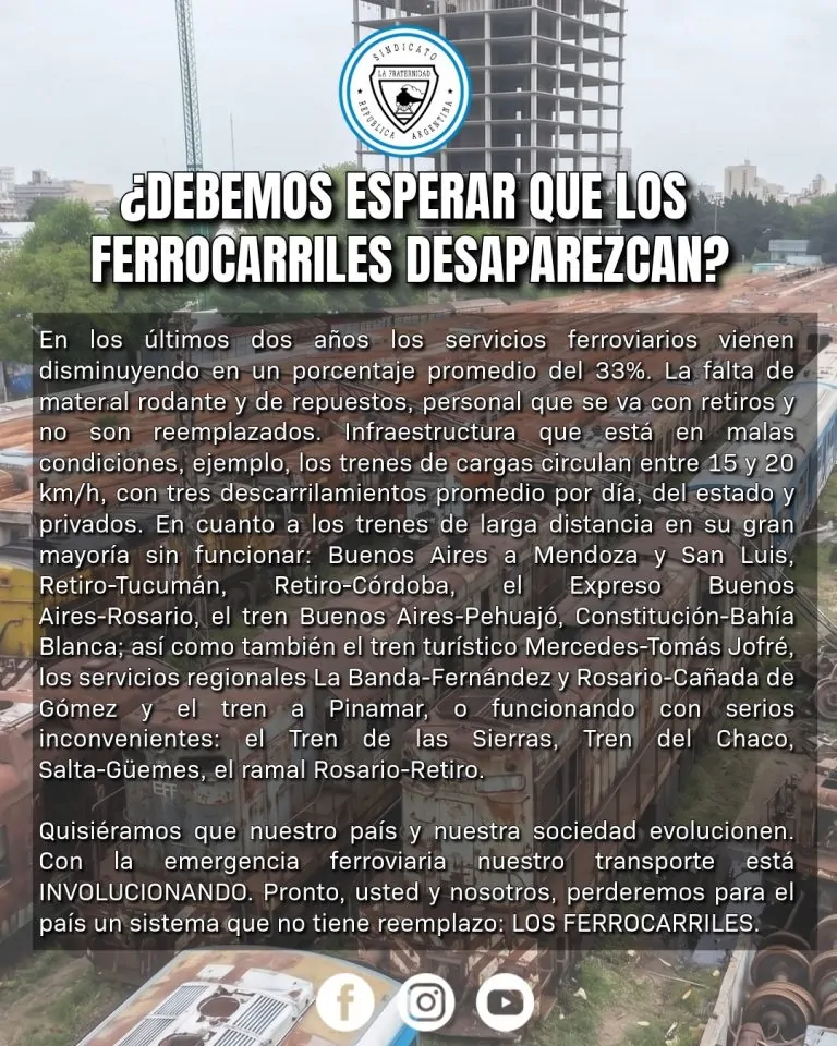 CABA 15 abr (La Fraternidad).-En los últimos dos años los servicios ferroviarios vienen disminuyendo en un porcentaje promedio del 33%. La falta de material rodante y de repuestos, personal que se va con retiros y no son reemplazados, Infraestructura que está en malas condiciones, ejemplo, los trenes de cargas circulan entre 15 y 20 km/h, con tres descarrilamientos promedio por día del estado y privados. En cuanto a los trenes de larga distancia en su gran mayoría sin funcionar: Buenos Aires a Mendoza y San Luis, Retiro-Tucumán, Retiro-Córdoba, el Expreso Buenos Aires-Rosario, el tren Buenos Aires-Pehuajó; así como también el tren turístico Mercedes-Tomás Jofré, los servicios regionales La Banda-Fernández y Rosario-Cañada de Gómez y el tren a Pinamar, o funcionando con serios inconvenientes: el Tren de las Sierras, Tren del Chaco, Salta-Güemes, el ramal Rosario-Retiro.