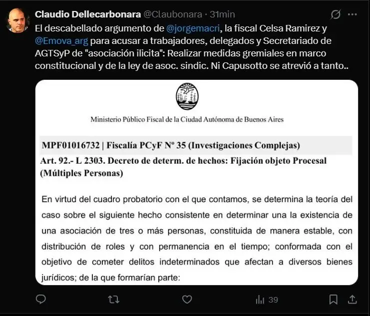En un comunicado titulado "Subte - Estado de alerta – Basta de criminalizar a las organizaciones obreras", la AGTSyP denunció que "el Gobierno de la Ciudad, la fiscal Celsa Ramírez y Emova impulsan una causa penal por supuesta asociación ilícita contra la AGTSyP y los trabajadores del subte".